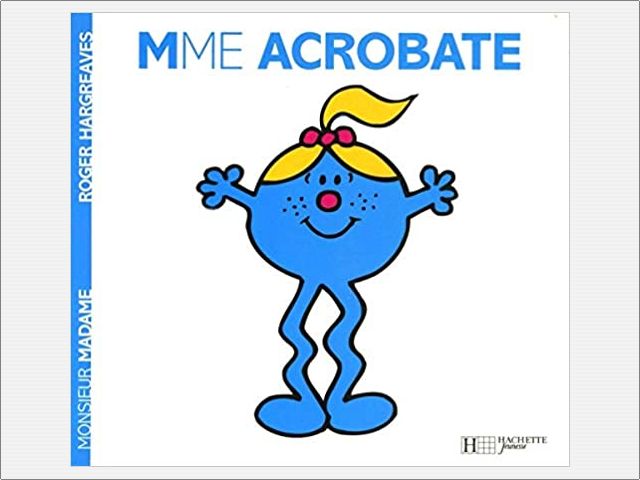 Madame Acrobate est forte en sport et en gymnastique. Tellement forte qu'elle en devient prétentieuse. Ce n'est du tout du goût de madame Magie, qui va lui donner une petite leçon afin qu'elle remettre les pieds sur terre...